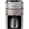 The CoffeeTEAM Pro Plus with Thermal Carafe is a grind and brew coffee maker the grinds beans fresh for every pot you brew. Redesigned by Capresso with an updated grinder, the CoffeeTEAM Pro Plus can be programmed for automatic brewing of up to 10-Cups of coffee. The conical steel burr grinder features an automatic cleaning function with an easy-to-remove top burr. The coffee maker also features a new ‘oily bean’ function that adjusts grinding time to accommodate for extra dark roasts. Enjoy your coffee at the same time every morning thanks to the 24 hour programmable clock/timer and Auto-On function. The AM/PM clock allows you to specify when you want the CoffeeTEAM to grind and brew your coffee. The easy to read LCD display makes programming the coffee maker a breeze as you navigate the menu settings to dial in your preferred settings.You can manually select to brew between 2, 4, 6, 8, and 10 cups of coffee at a time. The grinder will automatically adjust the time to grind the proper amount of coffee for the number of cups selected; you can also program the Auto-On feature with the same specifications. Can’t wait for that first pot? The drip stop function allows you to pause the brew cycle so you can pour yourself a cup of coffee. To conserve energy, the coffee maker will power off automatically after use. Your coffee is ground fresh for every pot you brew by a set of stainless steel conical burrs. The slow grinding of the burrs imparts minimal heat to preserve more aroma and flavor.