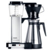 To brew, the Moccamaster uses a unique 9-hole shower head that soaks the grounds evenly for ideal extraction conditions. The machine can brew up to 10 cups of coffee in just six minutes and it is recommended that you preheat the thermal carafe ahead of time and brew an entire 10 cups in order to ensure temperature stability. The water reservoir is made of clear plastic and is labeled with increments from 2 to 10 cups allowing you to measure the precise amount of water you need. When adding ground coffee, the Moccamaster is compatible with both paper and gold tone filters. The Moccamaster also features Technivorm’s drip stop brew basket that allows you to brew a half pot, full pot, or stop dripping entirely for a quick cup of coffee before the brew cycle completes.